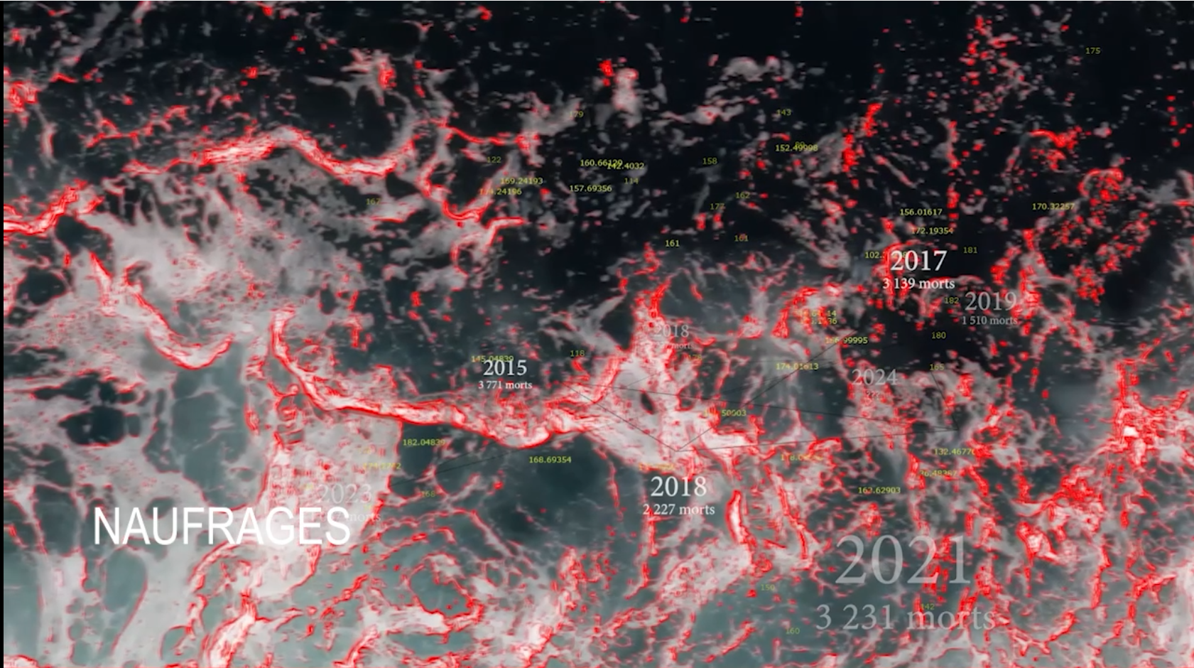 Water is blue because when light encounters water, it undergoes diffraction. The blue of the light spectrum remains on the surface, while the red is absorbed and lost in the depths of the abyss. This project uses a video showing the spray caused by the wake of a boat on the sea. The boat's progress and the flow of shapes modify the video on the screen. On this random, fluctuating map, data on migratory flows in the Mediterranean take shape. This mixture of video and generative art (the plots are created using the computer language that interprets the data) is completed by the appearance of words and numbers that refer to the migratory flows of recent years. The colors of the red outlines always refer to the rising seabed and what it has swallowed up. This visualization of flows is intended to be symbolic, and speaks of an often tragic reality, that of all migrants attempting to cross the Mediterranean. Always on the lookout for questions of representation, I'm interested here in informational flows, which I attempt to re-materialize using the physical and symbolic characteristics of water.